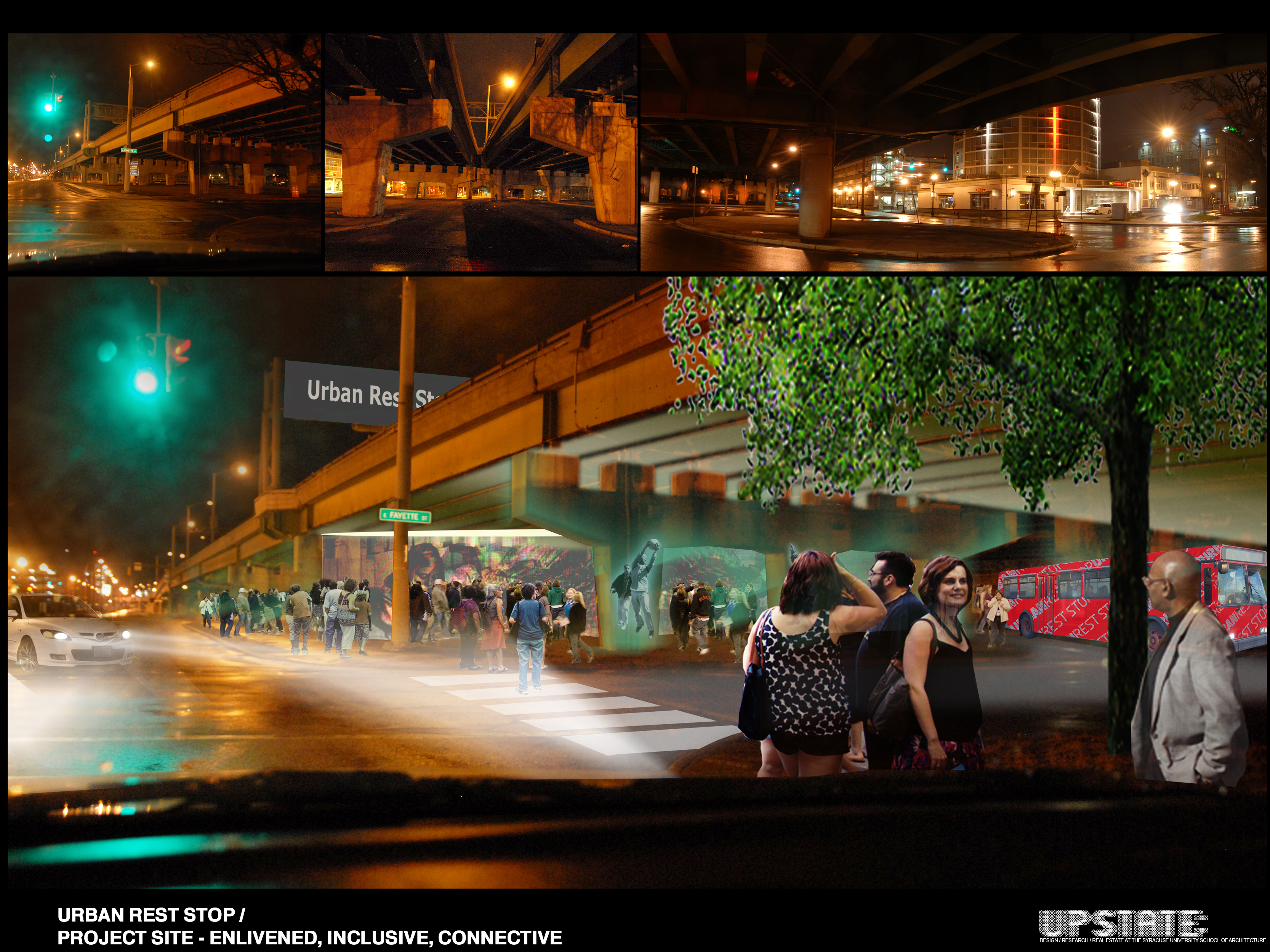 UPSTATE:, a center for design, research, and real estate at Syracuse University School of Architecture announced AFOAM as the winners of the Urban Rest Stop Design Competition on April 15. The goal of the competition, made possible by a grant from the National Endowment for the Arts, is to create an interactive environment for interstate travelers and residents beneath a section of I-81, where the elevated highway meets the Connective Corridor. A site of intense interest, the viaduct’s construction runs through Syracuse, separating the University Hill from the city’s revitalizing downtown. The I-81 viaduct reaches the end of its functional life in 2017. New York State Department of Transportation is getting closer to deciding the future of this stretch of the expressway, including rebuilding the section of highway or replacing the elevated viaduct with a boulevard.