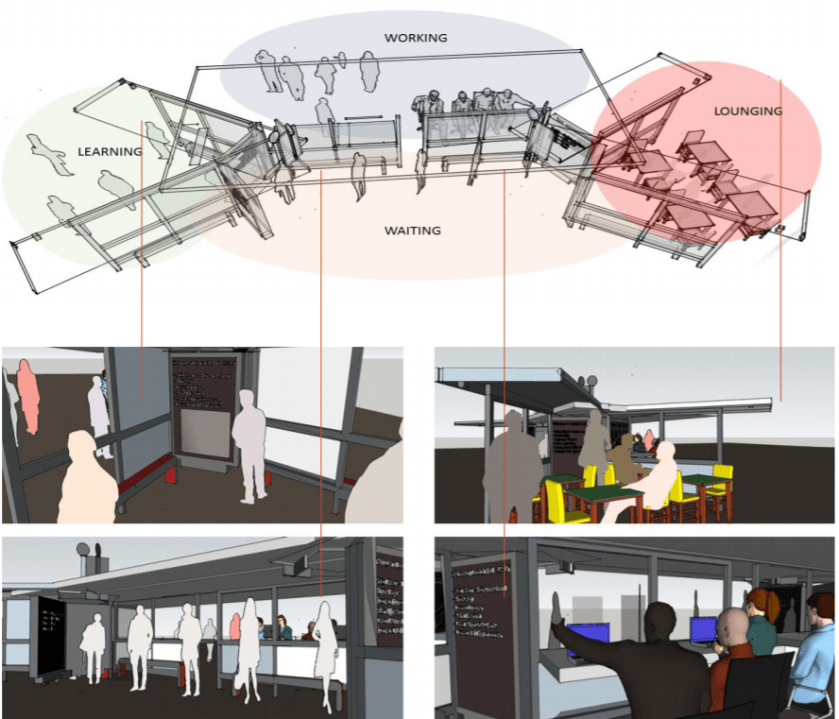 SENSEable City Lab is a cutting–edge multidisciplinary research group based at MIT that studies the interface between cities, people, and technologies and investigates how the ubiquity of digital devices and the various telecommunication networks that augment our cities, are impacting urban living. Marc Norman’s LAUNCH PAD (Aire de Lancement, in French) completed with the Lab for Benguerir, Morocco, reimagines planned stops along future shuttle routes as public space – providing seating, a shade structure and information displays – while also embedding both digital and physical educational techniques into the public realm. The physical distance between Benguerir and the Ville Verte is small; the social and psychological distances are vast. The LAUNCH PAD can reduce these distances by creating engaged interactions for researchers and the potential to transform lives of residents. Providing an interface that can address the gaps in educational attainment, wealth and access to knowledge holds the promise of launching a new era for Benguerir and a prototype for the Moroccan